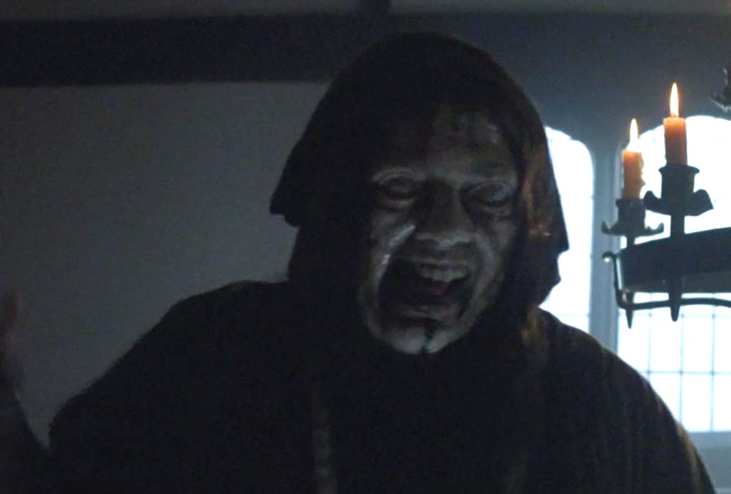 We learn that Anne was an orphan, and lived with the innkeeper. On the night of her disappearance, John spoke with the latter, and denied being involved with the girl. A patron of the tavern also speaks to John, asking to borrow his knife. He finds he can’t lend it, as it’s missing. Oh dear. The man sings a familiar tune, which sets John off, and then, hauntingly, they hear Anne singing it from outside. John, obviously appalled, begs them not to let her in. Obviously they do - but as she crosses the threshold the candles go out. When light is restored, there is no trace of her, bar a cupboard on the floor. John flees before the two others open it, but when they do something flies out of it like from a spring. Anne-like, ‘wrong’... with blood trailing behind it. This is definitely one of the film’s stronger moments.