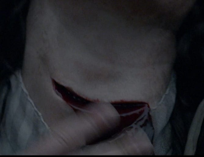 Speaking of shocking, around this point in the film we get a brief cut to her throat being slit. It’s brilliantly surprising and sudden.