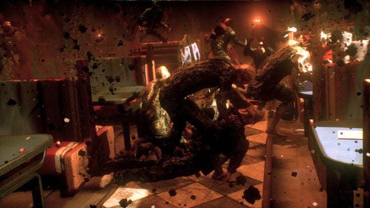 The Arkham Games go a lot further on the Creepy scale. We spend most of the time in Arkham Asylum, creeping along through old tunnels and dimly lit hallways, fighting off lunatics. We spend plenty of time running from the gigantic Killer Croc too, which is pretty frightening as comic-book villains go. Throughout these games we also see visions of corpses grinning at us (and sometimes even jumping at us), we explore the wreckage of a science experiment gone wrong (and find broken body of the scientist’s wife), we scan dead bodies strung up on rooftops, and we even watch a restaurant full of people kill each other in a drug-induced frenzy. Who knows what hides around the corner?
